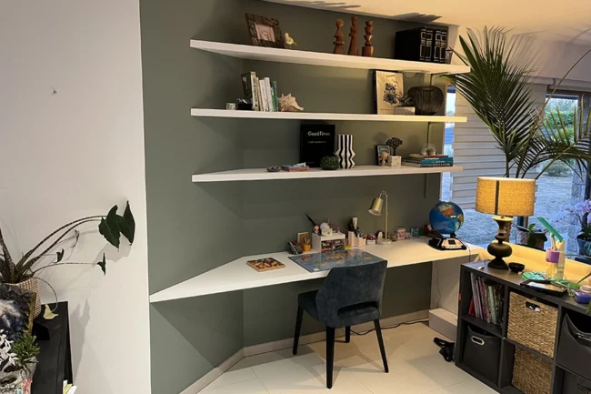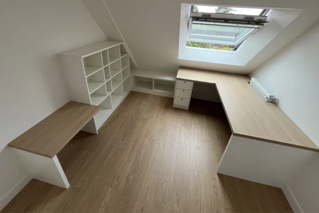 Prise des dimensions et schéma réalisé en accord avec les clients en fonction de leurs idées et de mes conseils, choix des matériaux avec les clients et plans sur mesure au bureau d’étude auprès de Artipôle à Plescop, fabrication de l’ensemble du bureau avec la bibliothèque et le meuble en partie basse sous rampant dans…