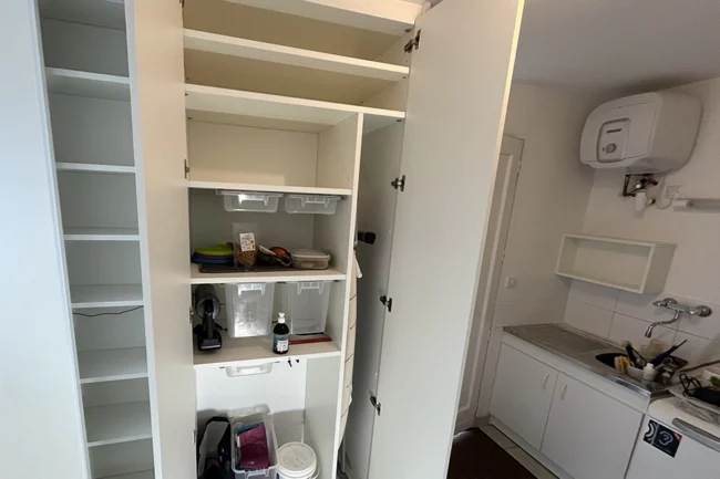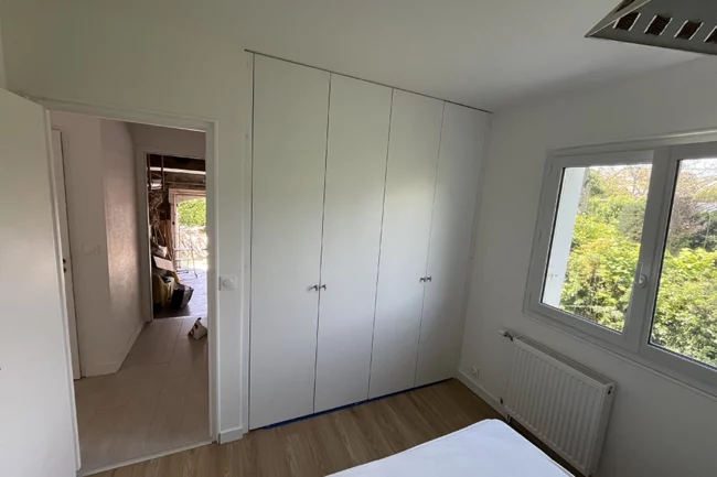 Prise des dimensions et schéma réalisé en accord avec les clients en fonction de leurs idées et de mes conseils, choix des matériaux avec les clients et plans sur mesure au bureau d’étude auprès de Artipôle à Plescop, fabrication de l’ensemble du placard dans les ateliers de Artipôle, l’ensemble est réalisé avec des panneaux de mélaminé…